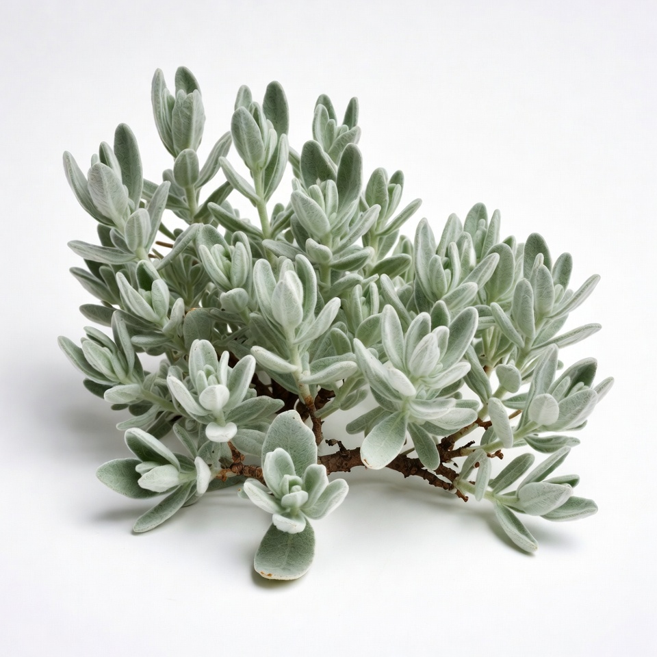 A cluster of silver bush plant with fuzzy gray-green leaves is arranged on a white background. The leaves are densely packed and covered in fine silvery hairs. Small stems and buds are visible among the foliage.