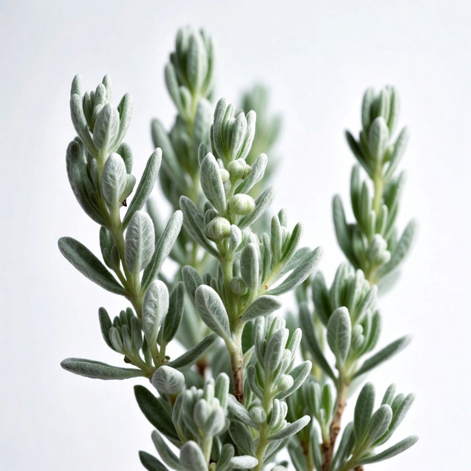 A cluster of silver-green shrub branches with small leaves and buds stands against a white background. The plant features densely packed, fuzzy foliage in shades of grayish-green. It appears freshly cut and isolated for display.