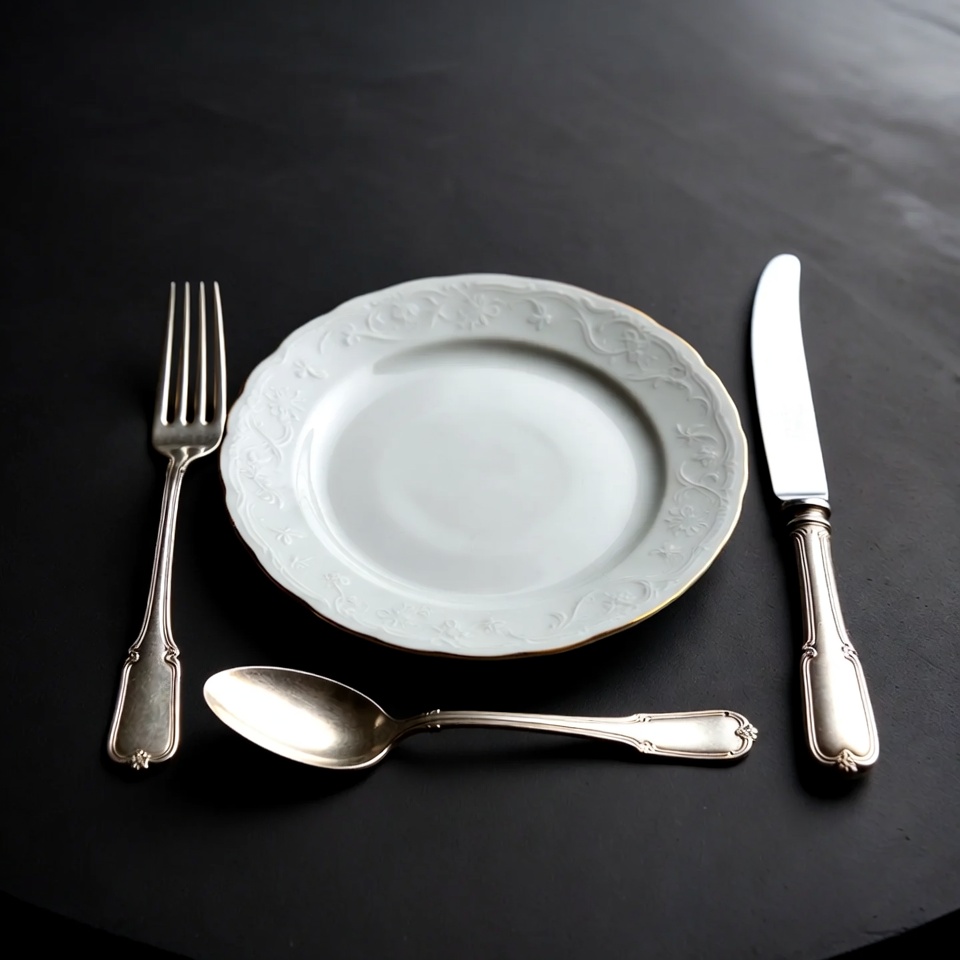 A white porcelain plate with floral edges sits centered on a black table. A silver fork, knife, and spoon are arranged neatly around the empty plate. The utensils feature ornate silver handles.