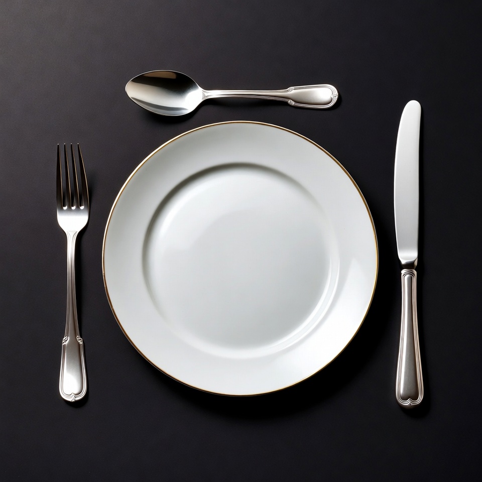 A white porcelain plate with a thin gold rim sits centered on a black background. Arranged around it are a shiny silver fork, knife, and spoon, all with ornate handles. The utensils are precisely placed in a formal table setting.