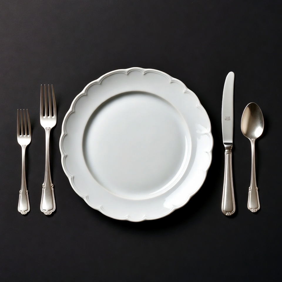 A white scalloped-edge plate sits empty in the center of a black background. Surrounding it are silver forks, knife, and spoon arranged symmetrically. The polished silverware gleams against the dark surface.