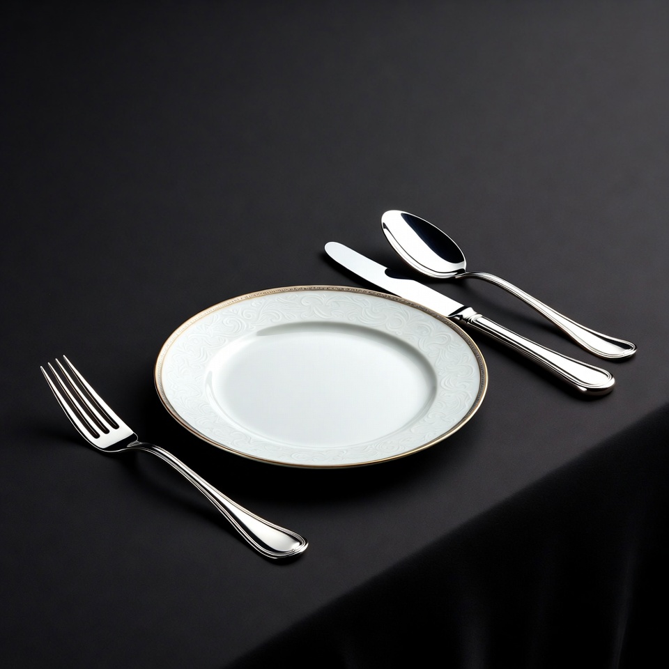 A white porcelain plate with gold rim sits centered on a black table. It is arranged with a fork, knife, and spoon placed neatly around it. The silverware has elegant curved handles and shines against the dark background.
