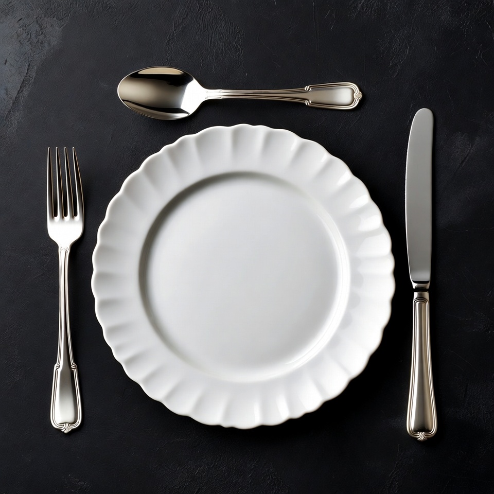 A white scalloped plate sits centered on a dark textured background. Surrounding it are silver utensils including a fork, knife, and spoon arranged symmetrically. The flatware has ornate handles and shines against the black surface.