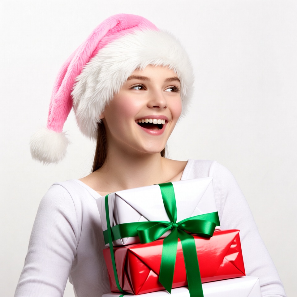 A young White girl with straight brown hair smiles joyfully while wearing a pink Santa hat with white fur trim. She holds a stack of wrapped presents, including white and red boxes tied with green ribbons, against a plain white background. She wears a white top and looks slightly to the side.