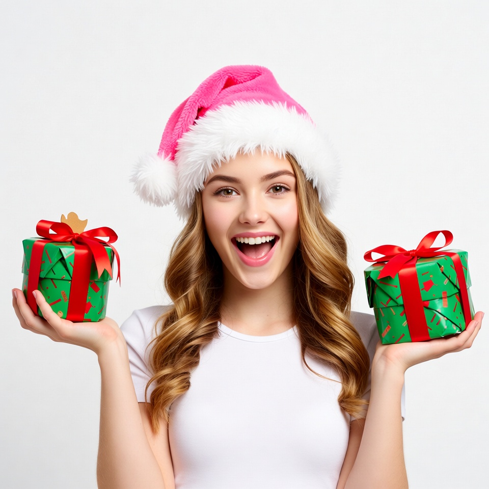 A young woman with long wavy blonde hair wears a pink Santa hat and white t-shirt while holding two green wrapped Christmas gift boxes with red bows. She stands against a white background, smiling widely with an excited expression. Her arms are outstretched, displaying the festive presents clearly.