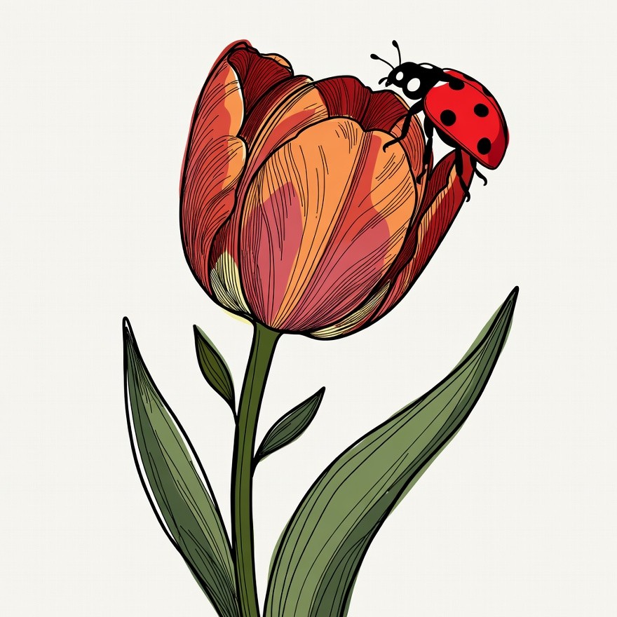 A vibrant red tulip with layered orange petals stands tall on a green stem with leaves. A black-spotted red ladybug perches on one of the petals. The illustration features bold line art on an isolated white background.