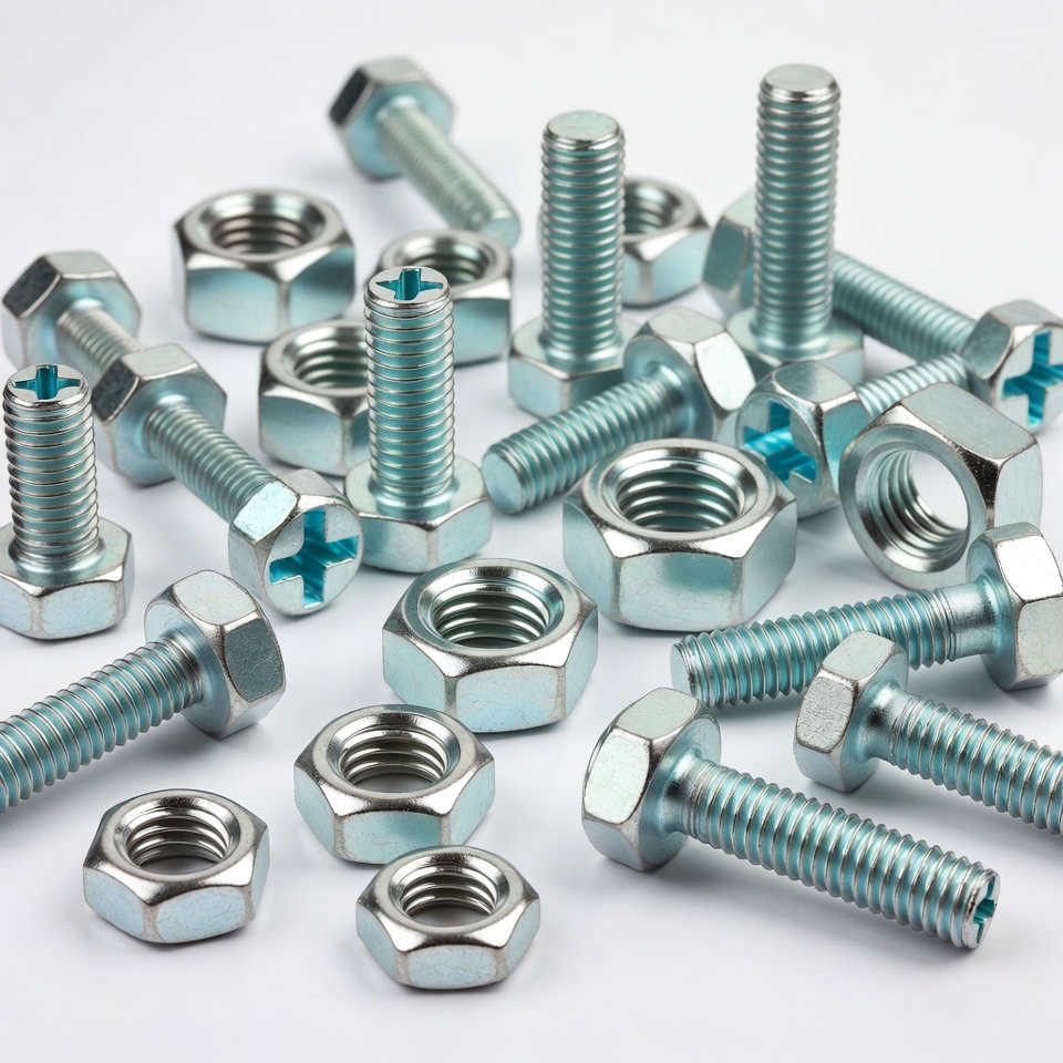 construction, crosshead bolts, fasteners, hardware, hex bolts, industrial, isolated, machine screws, metal bolts, metallic, nuts, phillips bolts, scattered, shiny, silver bolts, silver nuts, tools, white background, bolts
