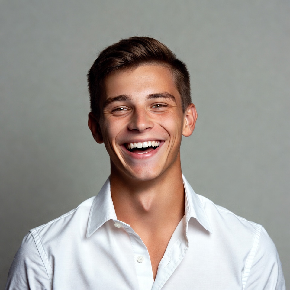 A young man with short brown hair smiles broadly, showing his teeth, against a plain gray background. He wears a white collared shirt with the top buttons undone. His eyes are crinkled in laughter and he faces the camera directly.