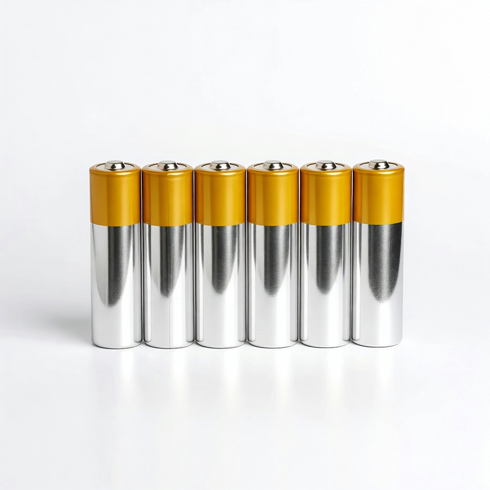 Six AA batteries stand upright in a straight row on a white background. Each battery features a shiny silver body with a yellow top and gold positive terminal. They are evenly spaced and aligned perfectly.