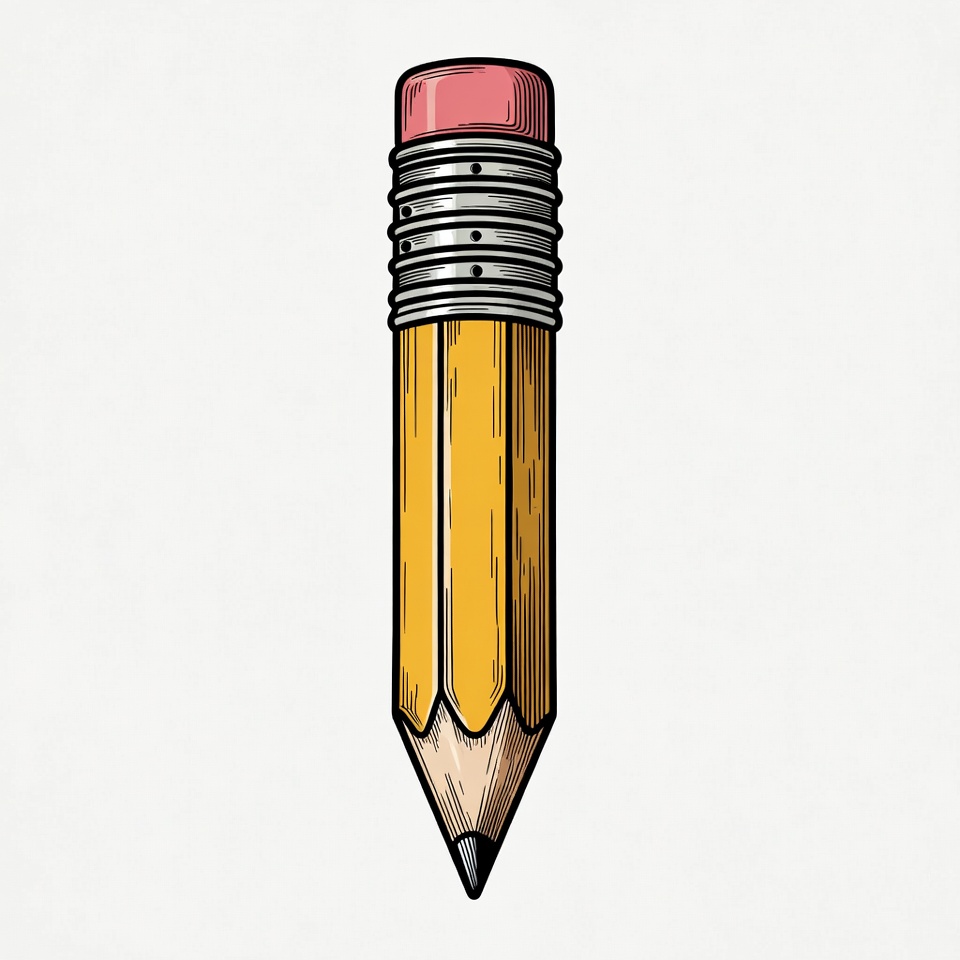 A hand-drawn illustration of a yellow wooden pencil with a pink eraser on top and silver ferrule. The pencil features detailed wood grain texture and a sharp gray graphite tip. It stands vertically on a white isolated background.