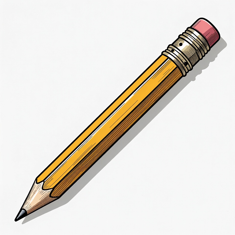 A detailed illustration of a classic yellow pencil with a pink eraser and metal ferrule lies angled on a white background. The wooden body features textured grain lines, and the graphite tip is sharply pointed. It is depicted in a realistic line art style.