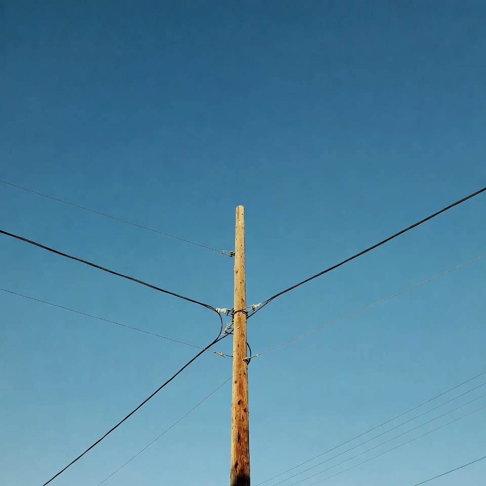 blue sky, crossarms, electrical wires, electricity pole, infrastructure, insulators, outdoor, pole wires, power grid, power lines, sky background, telephone pole, transmission lines, wooden pole, utility pole