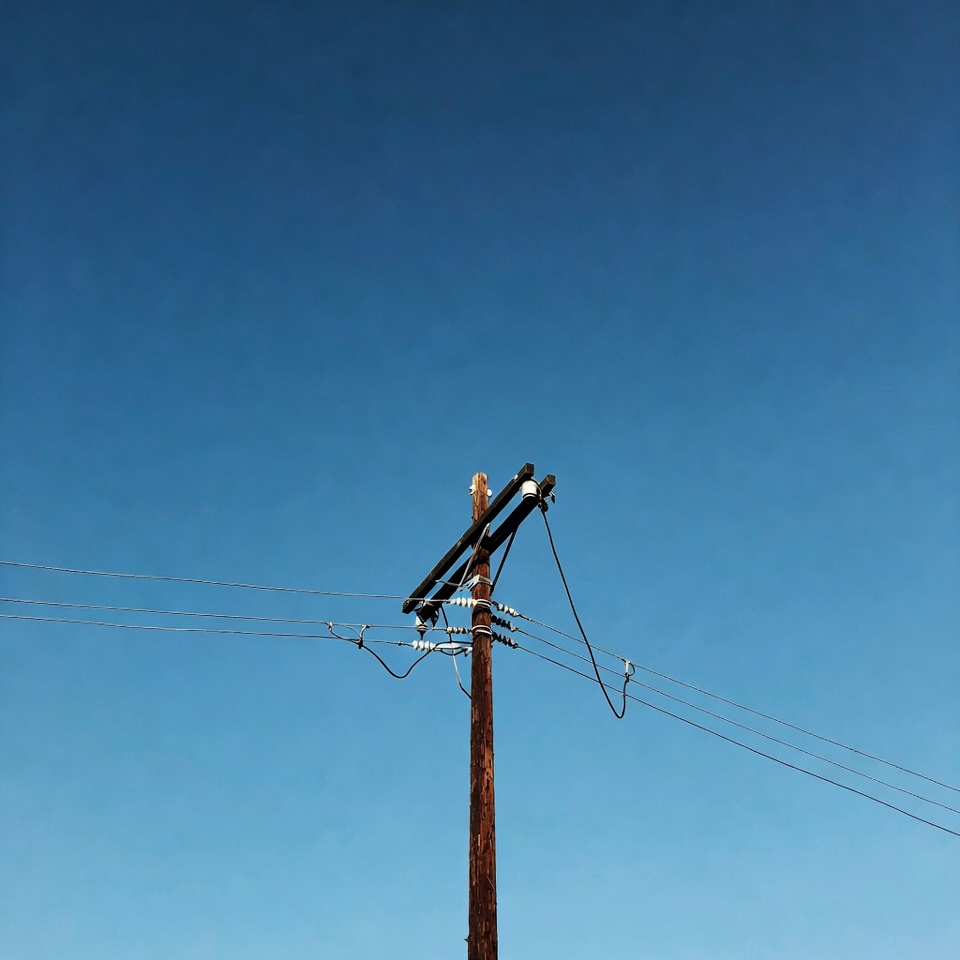 bird, blue sky, brown owl, clear sky, crossarm, electricity pole, insulators, nature, outdoor, perched, power lines, raptor, transmission lines, utility pole, wildlife, wooden pole, owl