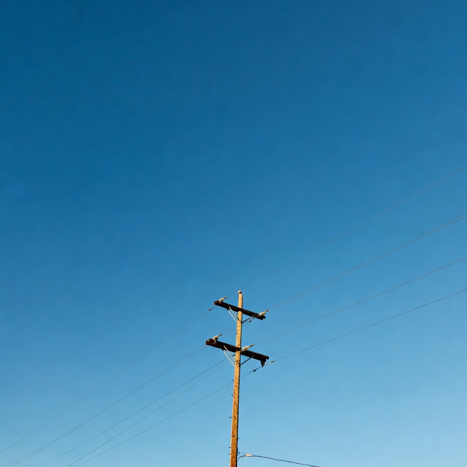 blue sky, crossarms, electrical wires, electricity pole, infrastructure, insulators, outdoor, pole, power lines, power pole, sky, transmission pole, wires, wooden pole, utility pole