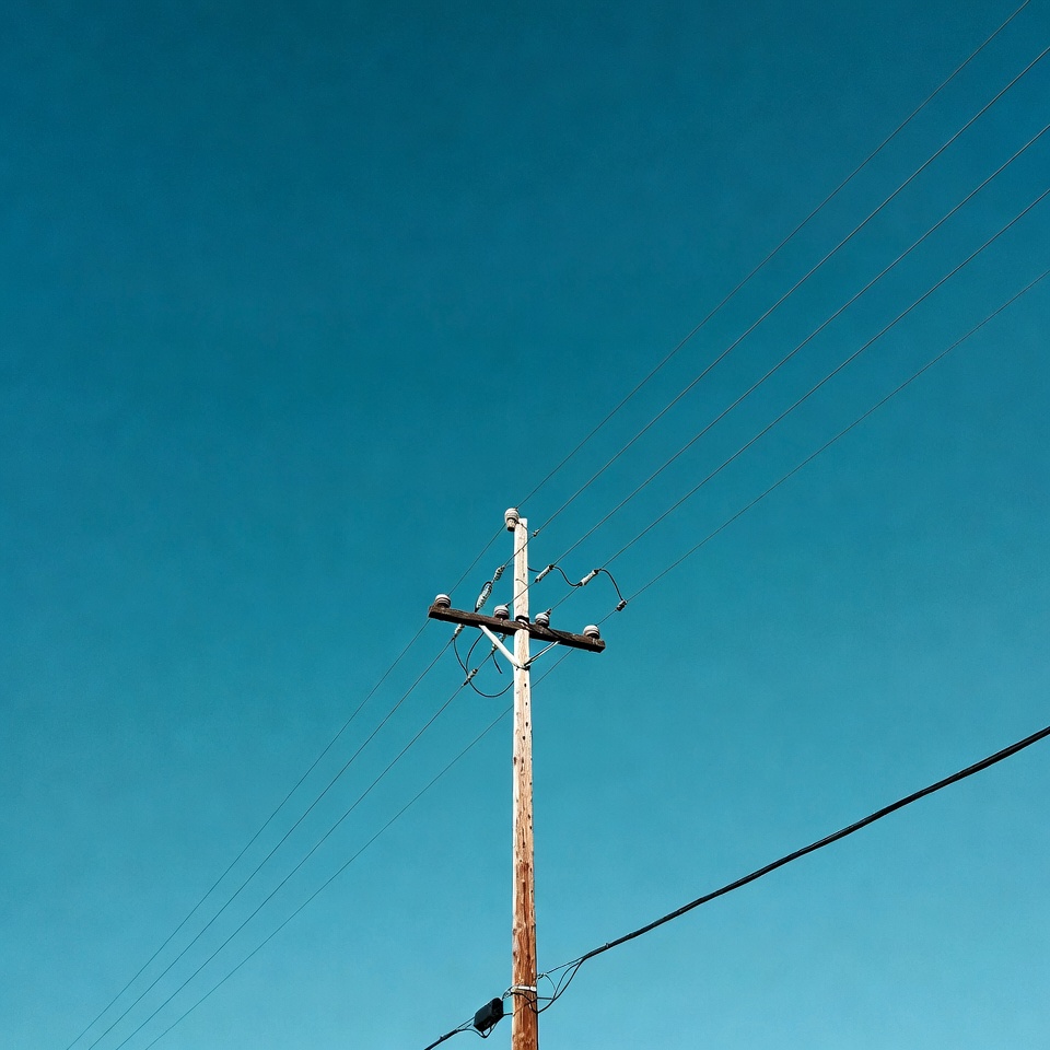 blue sky, crossarm, electric utility, electrical wires, electricity pole, infrastructure, insulators, outdoor, power lines, power pole, sky background, transmission lines, wooden pole, utility pole