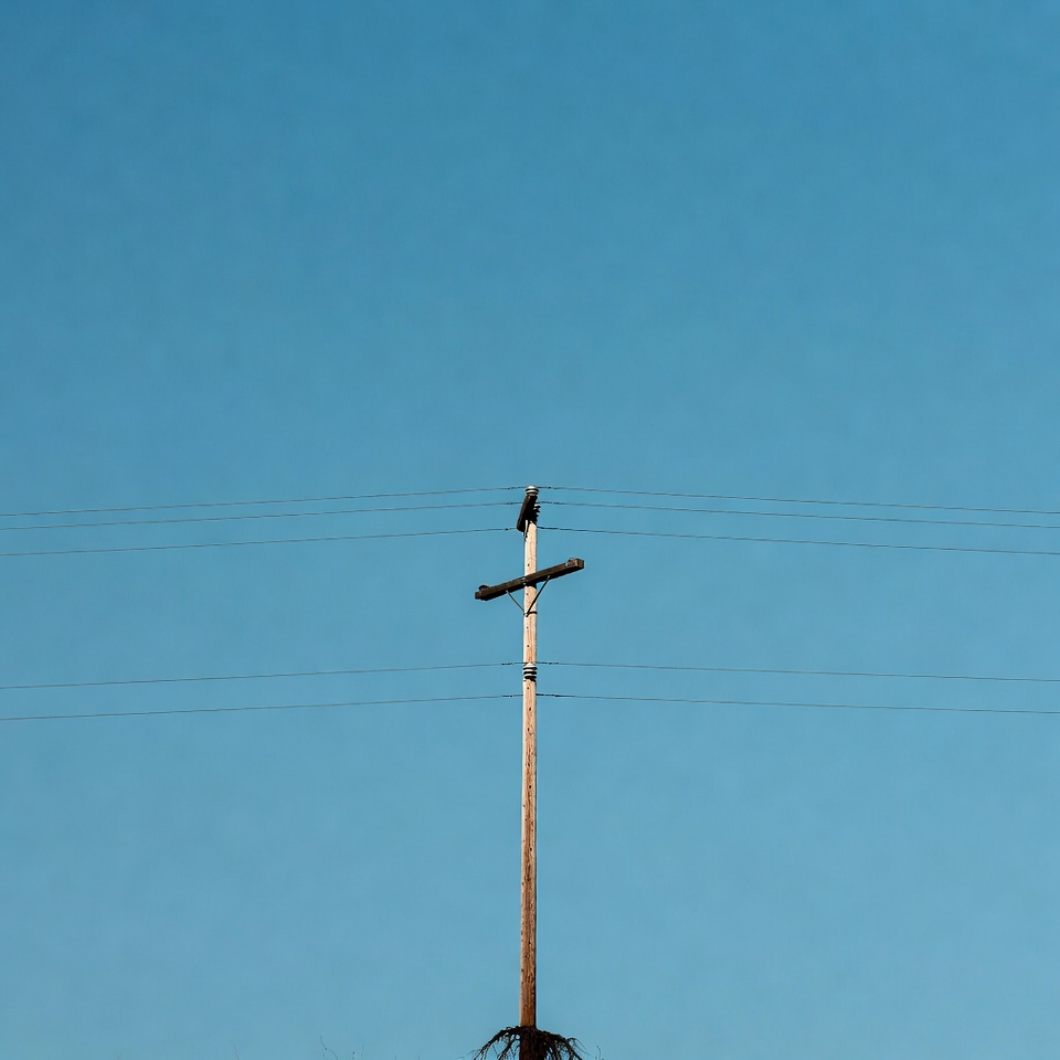 bird, blue sky, clear sky, electricity pole, outdoor, perched bird, pole bird, power lines, power lines bird, rustic pole, sky background, tall pole, telephone pole, wooden pole, utility pole
