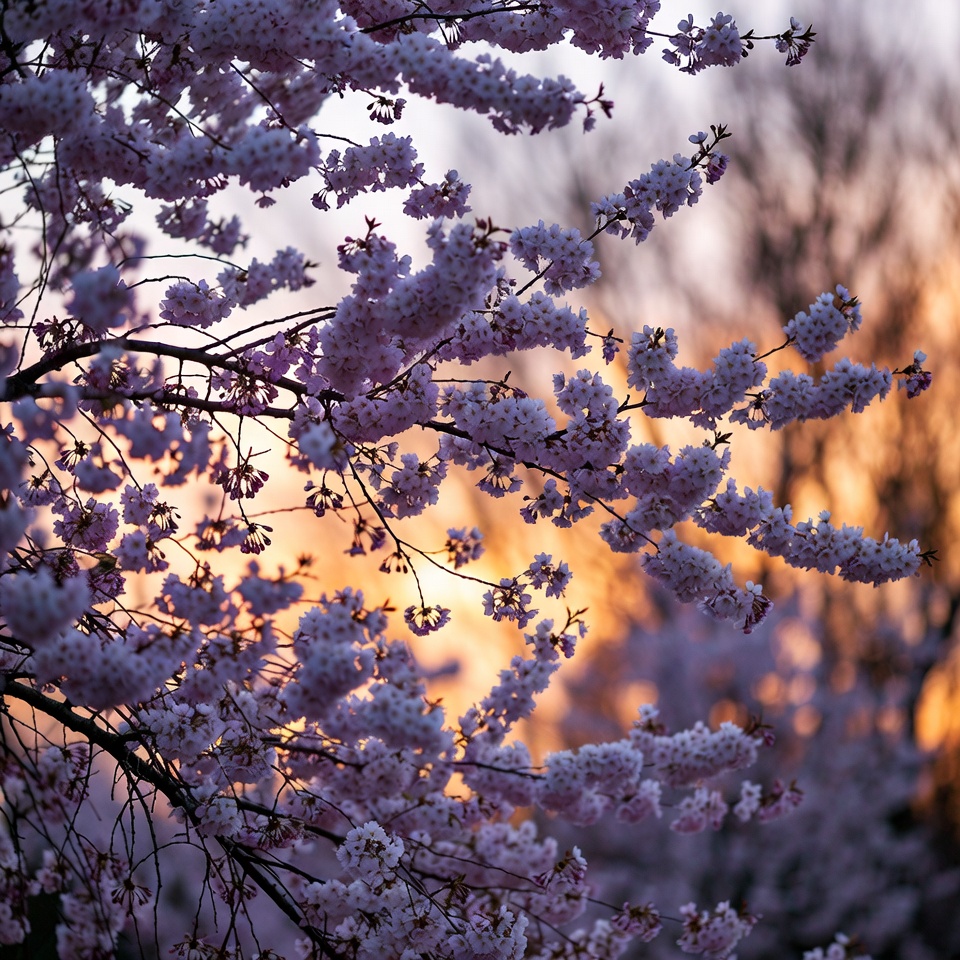 Japanese cherry, bloom, blossoms, bokeh, branches, close-up, delicate petals, evening sky, floral, flowering tree, flowers, nature, outdoor, petal clusters, pink flowers, purple flowers, sakura, soft focus, spring flowers, sunset, tree branches, twilight, warm light, cherry blossoms