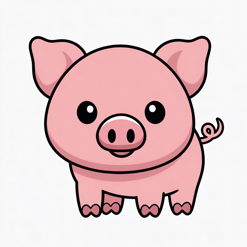 A kawaii-style cartoon pig with pink skin, large black eyes, small snout, and curly tail stands on four legs. It has a cheerful expression and simple outlines on a white isolated background. The illustration features chibi proportions with stubby limbs.
