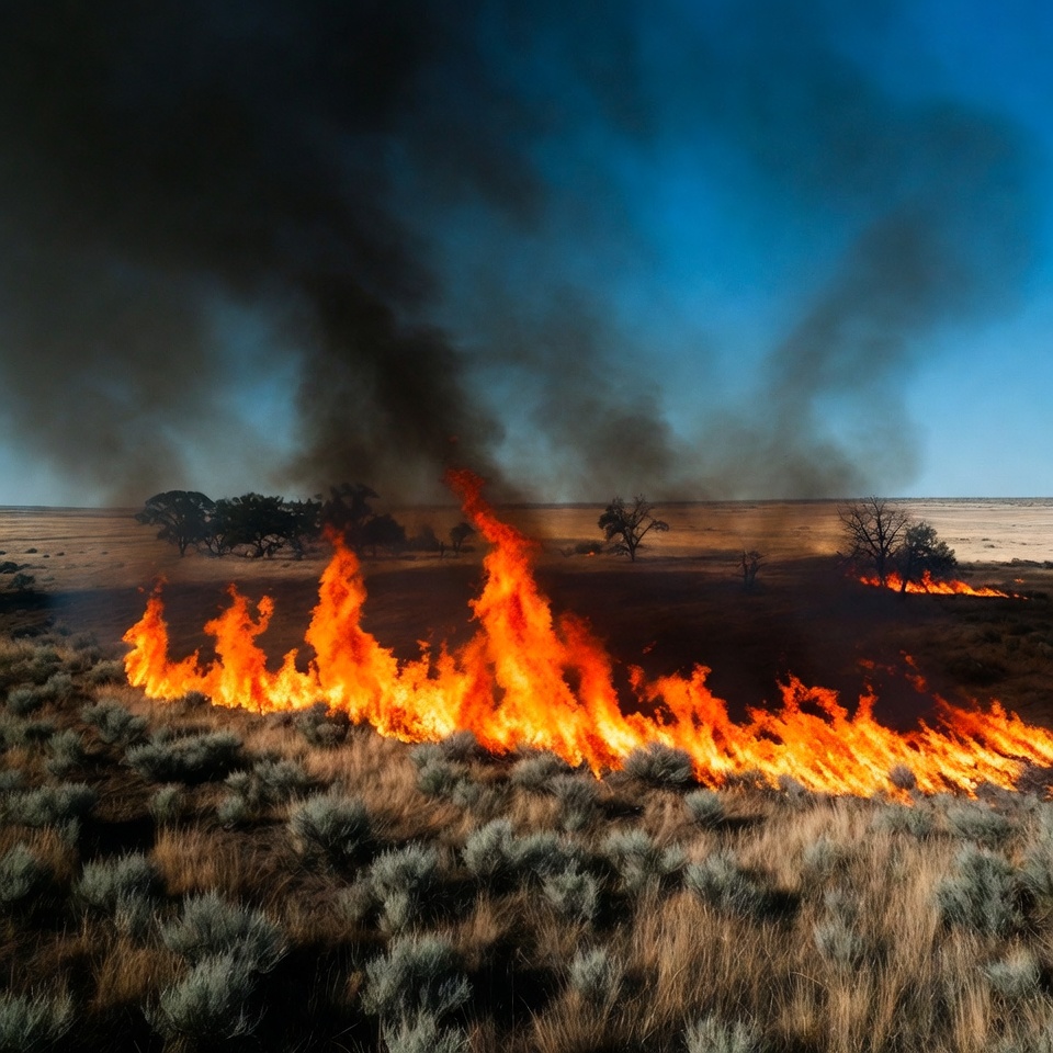 arid landscape, black smoke, blaze, blue sky, burning trees, bushfire, dry grass, embers, fiery line, firestorm, flames, forest fire, grass fire, grassland, heat waves, inferno, natural disaster, orange flames, outback fire, prairie fire, scorched earth, smoke, smoke plume, uncontrolled fire, wildfire