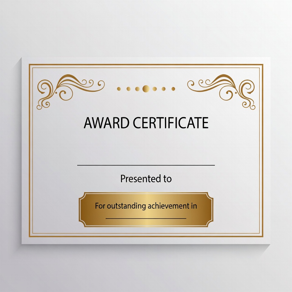 A blank award certificate features elegant gold borders and ornate swirls on a white background. It includes the title 'AWARD CERTIFICATE' at the top and a line for 'Presented to' below. A gold label in the center reads 'For outstanding achievement in'.