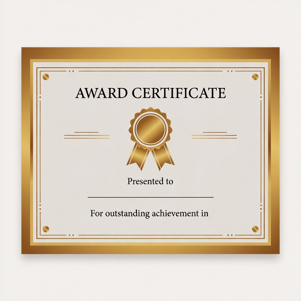 A gold-framed award certificate features 'AWARD CERTIFICATE' at the top and a large golden seal in the center. Below it reads 'Presented to' with a blank line, followed by 'For outstanding achievement in' and another blank. The design includes ornate borders and is on a white background.
