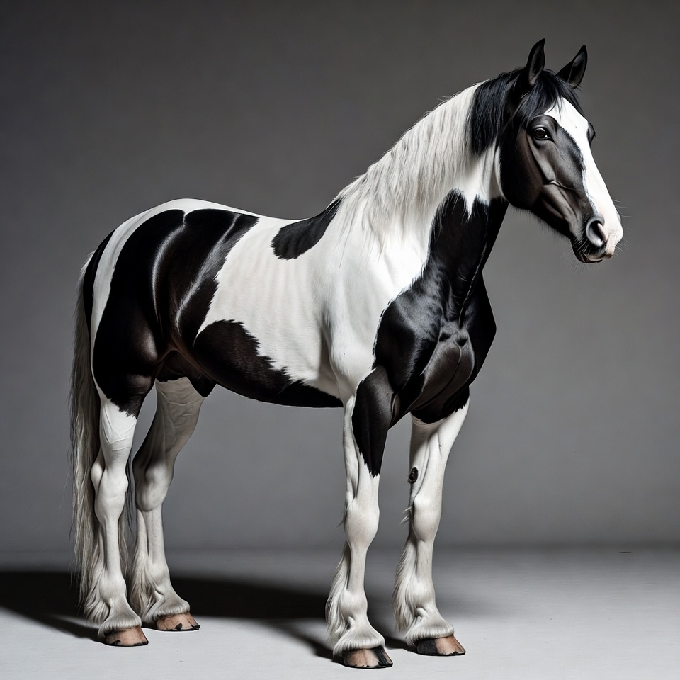 A majestic piebald horse with black and white patches stands profile on a plain gray background. It has a long flowing black mane and tail, muscular build, and feathered white legs. The horse gazes slightly to the side with a calm expression.