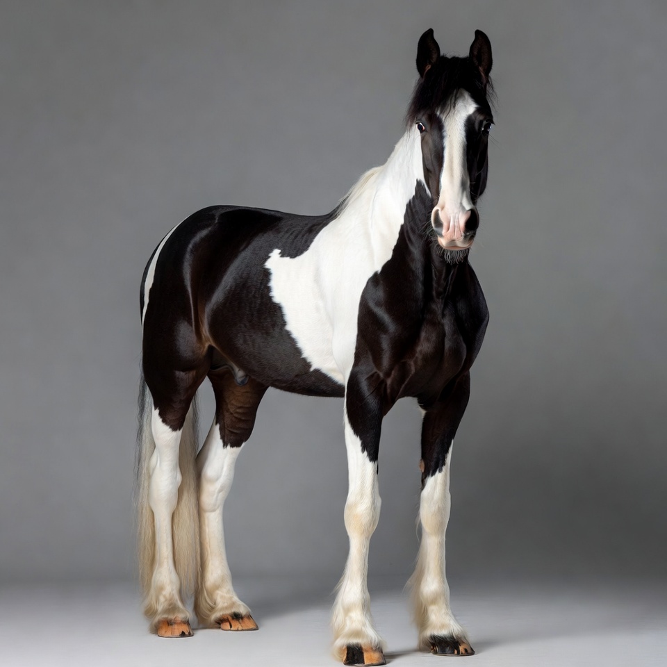animal, black and white horse, equestrian, equine, farm animal, gray background, horse, isolated background, mane, stallion, standing horse, tail, piebald horse