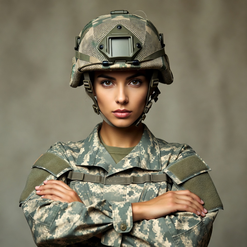 A woman with dark hair wears a camouflage helmet and military uniform, standing with arms crossed against a gray background. Her uniform features camouflage patterns on the jacket and helmet with night vision mount. She has a serious expression and direct gaze at the viewer.