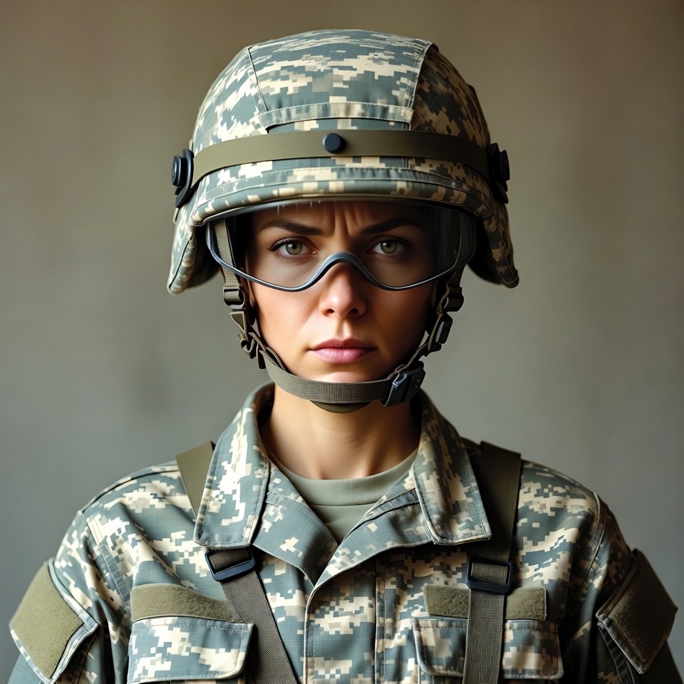 White, armed forces, army, camo helmet, camouflage, combat gear, female, goggles, helmet, isolated background, military, military woman, protective eyewear, serious expression, soldier, stern face, uniform, woman