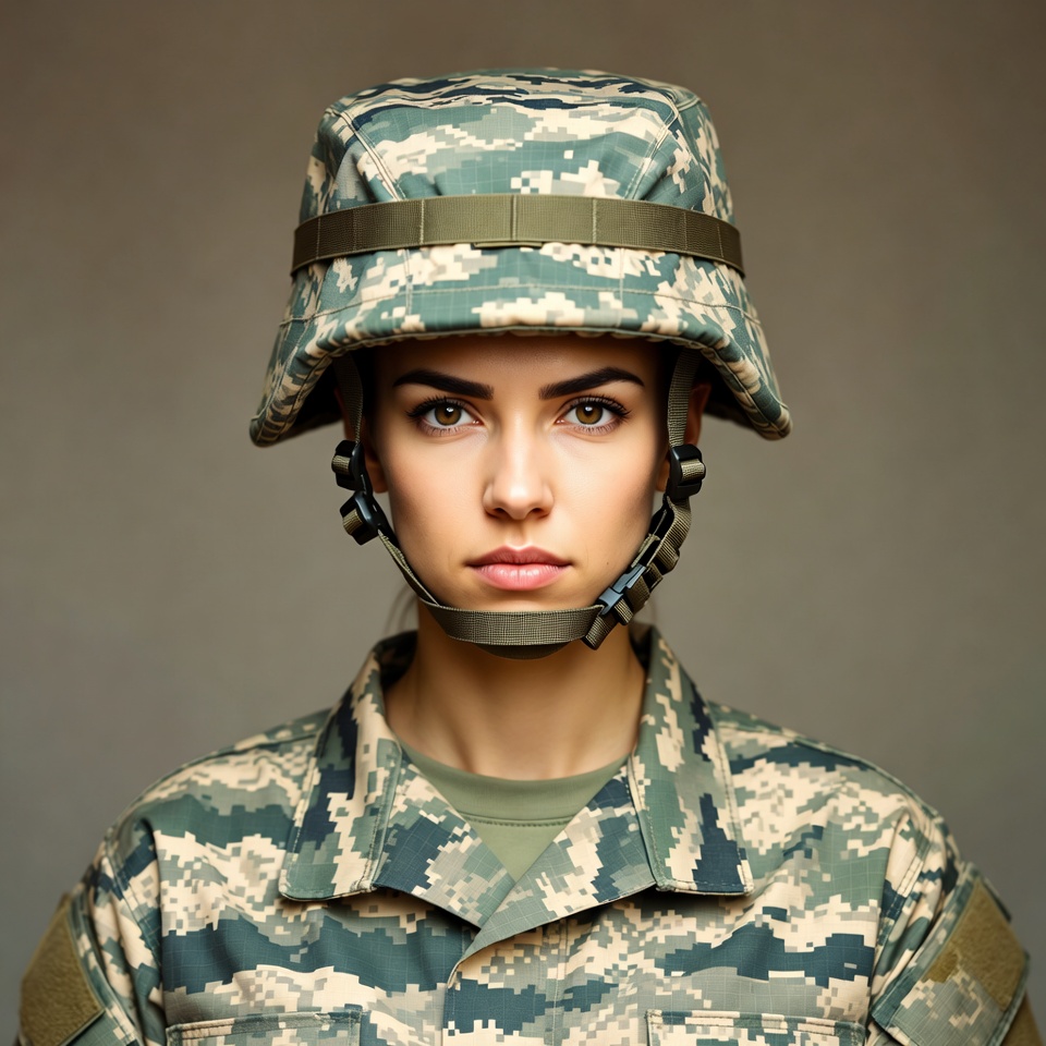 army, camo, camouflage helmet, chin guard, dark hair, female, gray background, green camo, headgear, helmet, isolated background, military uniform, military woman, portrait, serious face, soldier, straps, uniform, young woman, woman