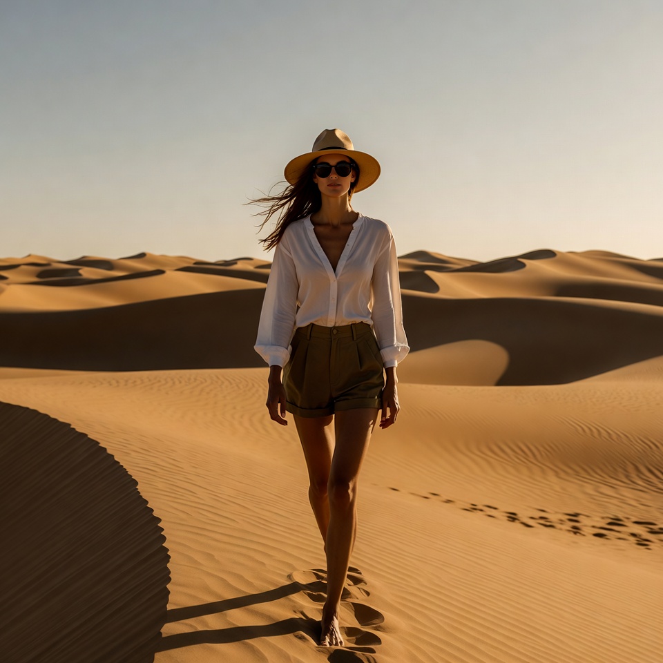A woman with long flowing hair and sunglasses walks barefoot through golden sand dunes. She wears a white button-up shirt, khaki shorts, and a beige fedora hat. The vast desert landscape stretches endlessly under a bright sky.
