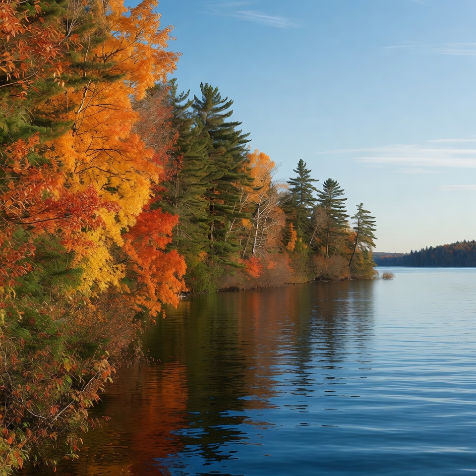 Vibrant orange and red autumn trees line the shore of a calm blue lake. Evergreen pines mix with colorful deciduous trees, their reflections shimmering in the still water. A clear sky enhances the fall foliage scenery.