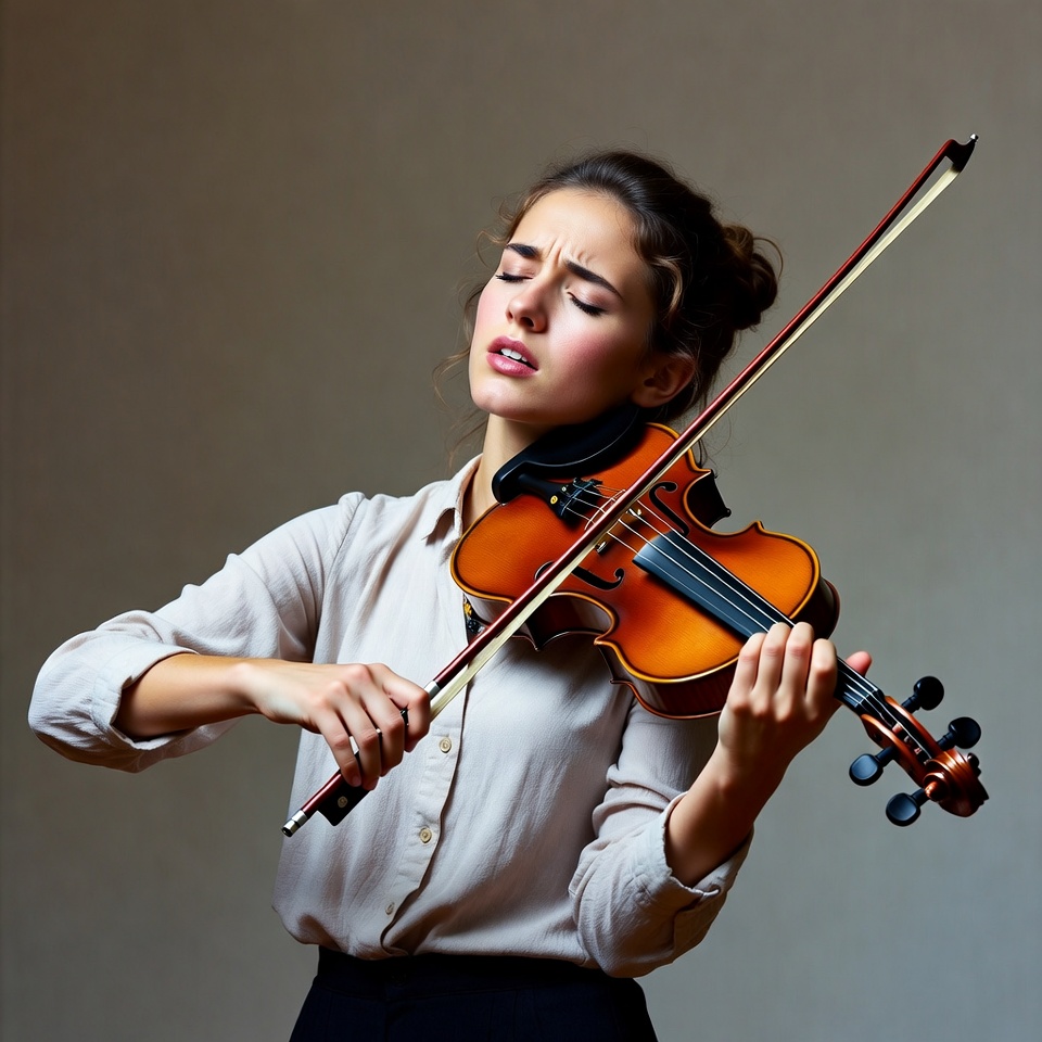 A young woman with dark hair in a bun plays a violin against a plain beige background. She wears a white collared shirt and black pants, holding the bow with her right hand and the violin with her left under her chin. Her eyes are closed in concentration as she performs.