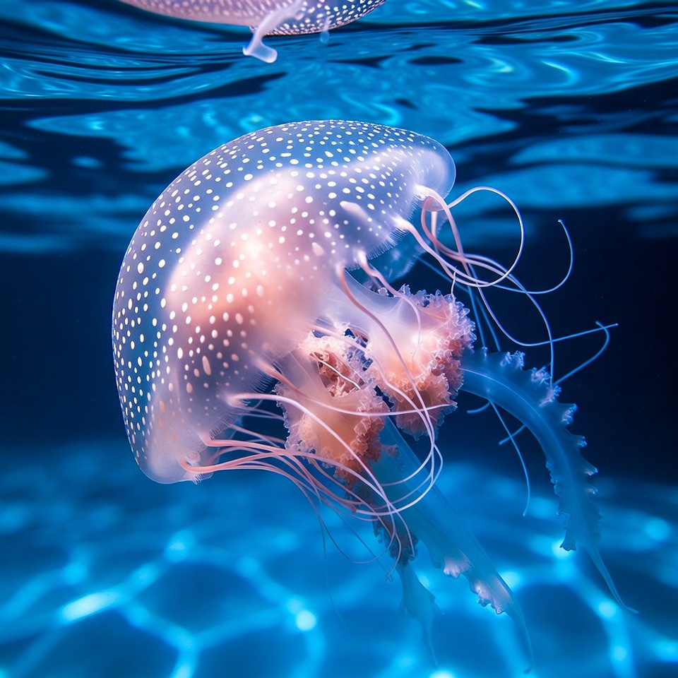aquarium, aquatic, bioluminescent, blue water, coral reef, drifting, floating, gelatinous, marine life, medusa, nature, ocean, pink jellyfish, sea creature, spotted jellyfish, tentacles, translucent, underwater, wildlife, jellyfish