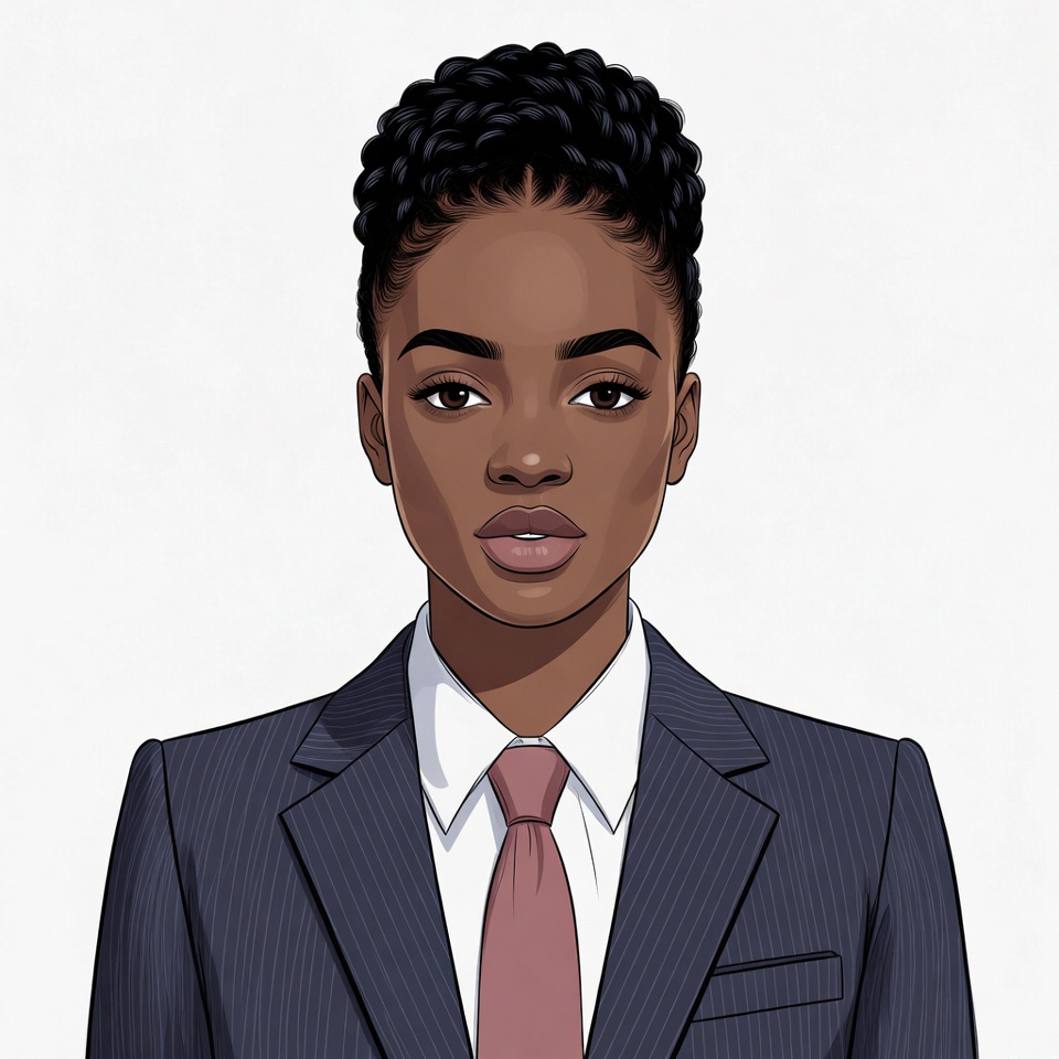 beautiful woman, black hair, business attire, curly hair, digital illustration, female, headshot, isolated background, navy suit, pink tie, portrait, professional woman, short afro, suit jacket, white shirt, woman, young woman, African-American woman