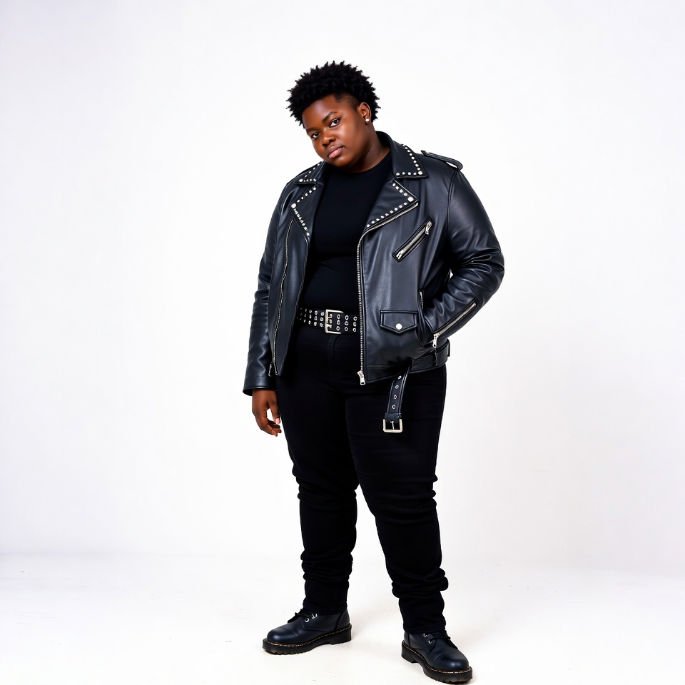 Black woman, Dr. Martens boots, biker jacket, black leather, black pants, black turtleneck, curly hair, edgy style, female, leather jacket, plus size, punk fashion, serious expression, short hair, standing pose, streetwear, studded belt, studded jacket, white background, woman, young woman, African-American woman