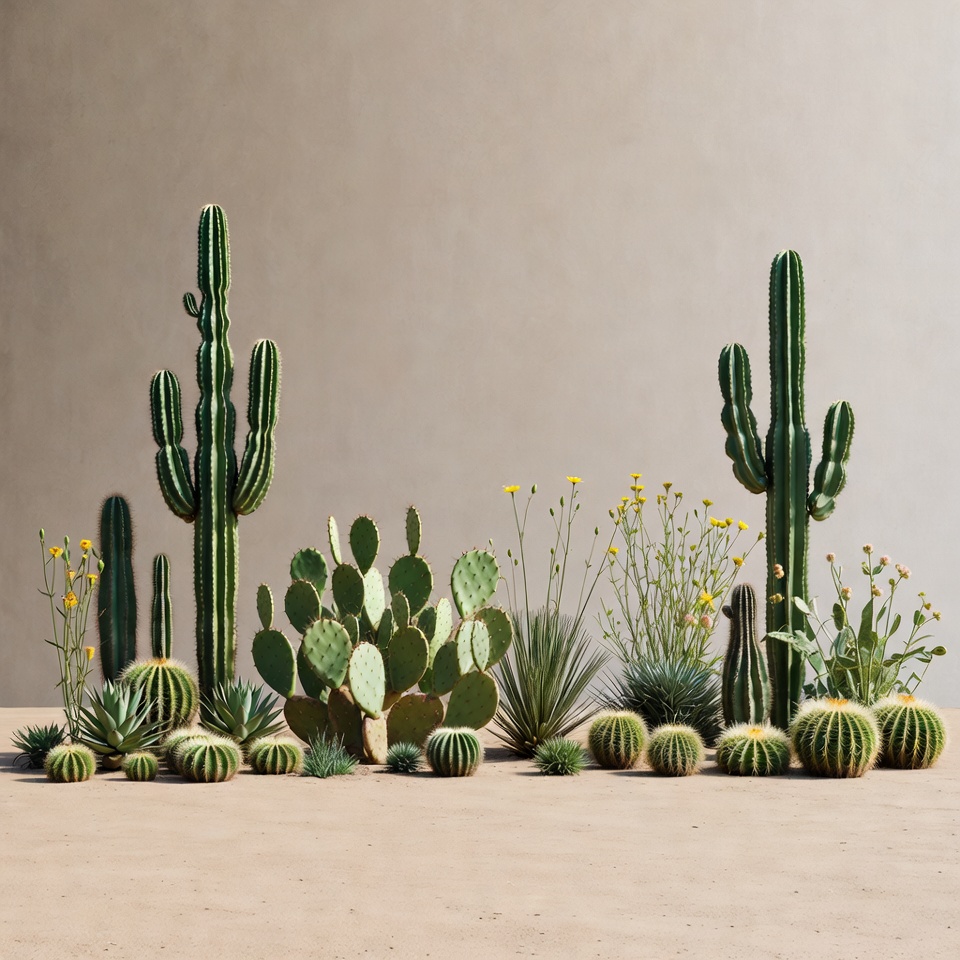 3D render, arrangement, barrel cactus, beige wall, clustered plants, desert flora, desert plants, green plants, isolated background, potted plants, prickly pear, saguaro, sandy ground, small cactus, spines, succulents, tall cactus, wildflowers, yellow flowers, cactus