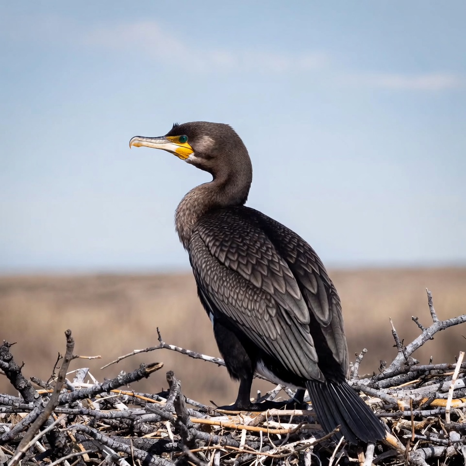 animal, avian, bird, black bird, blue sky, branches, double-crested cormorant, feathers, green eyes, nature, nest, profile view, sea bird, standing, water bird, wildlife, wings, yellow bill, cormorant
