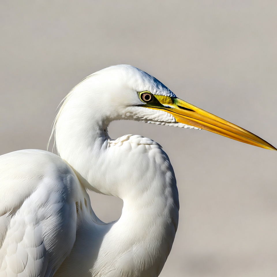 A great egret stands with its long neck curved and bright yellow beak extended. Its white feathers are detailed with subtle textures, and it has a striking green-yellow eye. The bird is isolated against a light beige background.