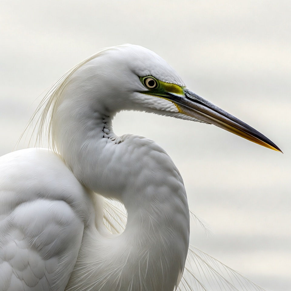 avian, bird, close-up, feathers, great egret, green eye, heron, isolated background, long beak, nature, neck curve, plumes, portrait, water bird, white bird, white egret, wildlife, yellow beak, egret