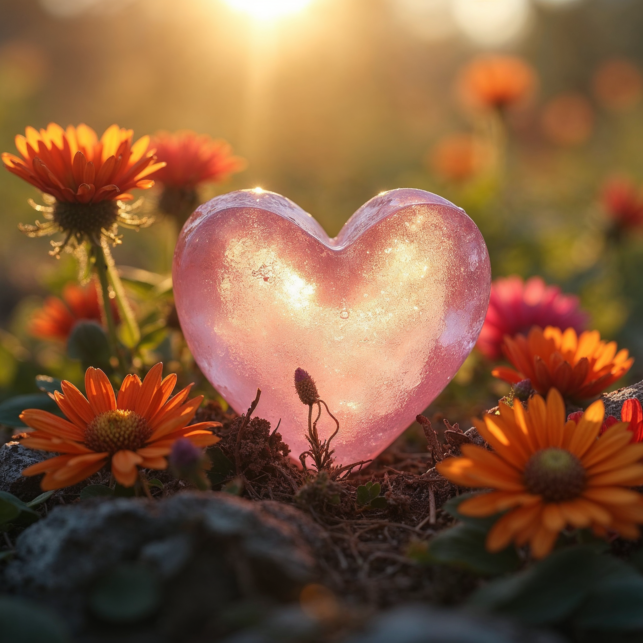 A translucent pink heart sits nestled among vibrant orange daisies and green grass on mossy ground. Sunlight streams through the heart, creating a glowing effect with rays piercing the background. Surrounding flowers and plants add a natural field setting.