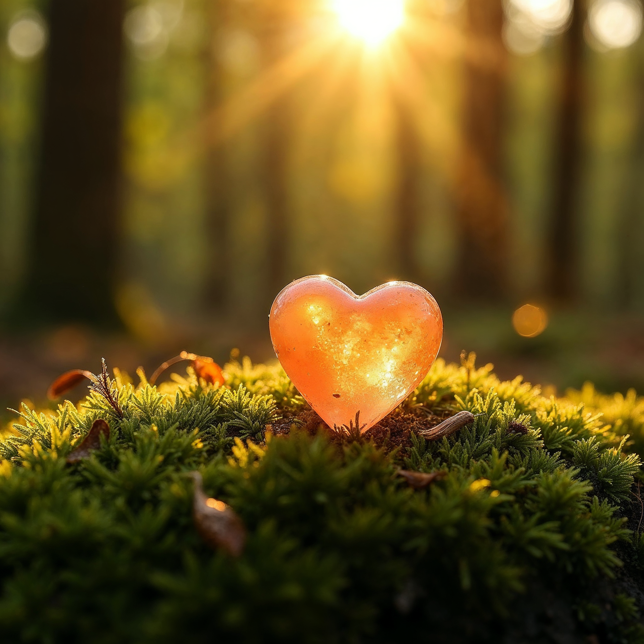 A glowing orange heart sits on a bed of green moss surrounded by fallen leaves in a dense forest. Sunlight filters through the trees, casting warm rays that illuminate the heart with a sparkling effect. The background features tall trees and soft bokeh light.