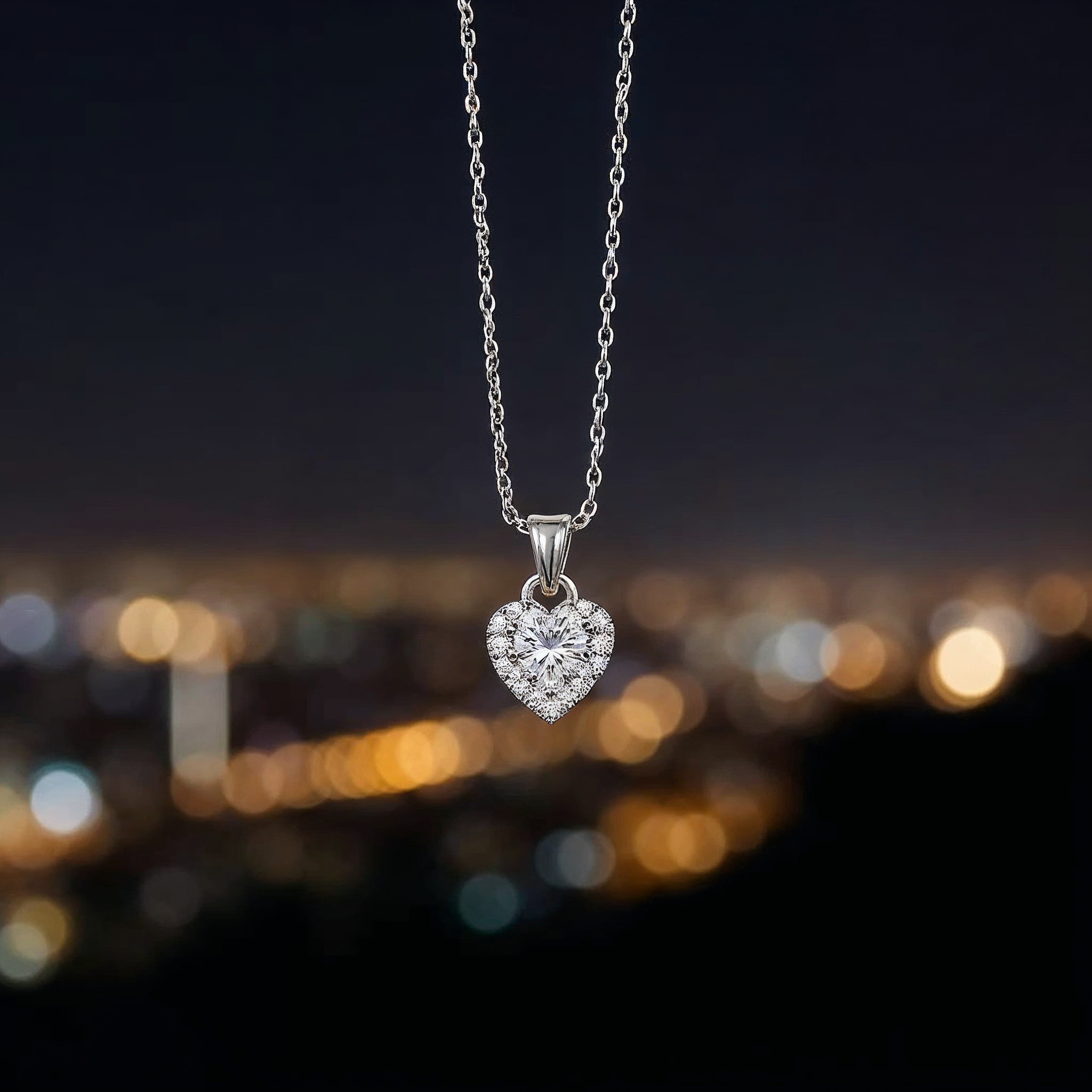 bokeh background, city lights, diamond heart, fine jewelry, heart pendant, isolated jewelry, jewelry, jewelry photography, luxury jewelry, necklace, night skyline, pavé diamonds, pendant, silver chain, sparkling diamonds, diamond necklace