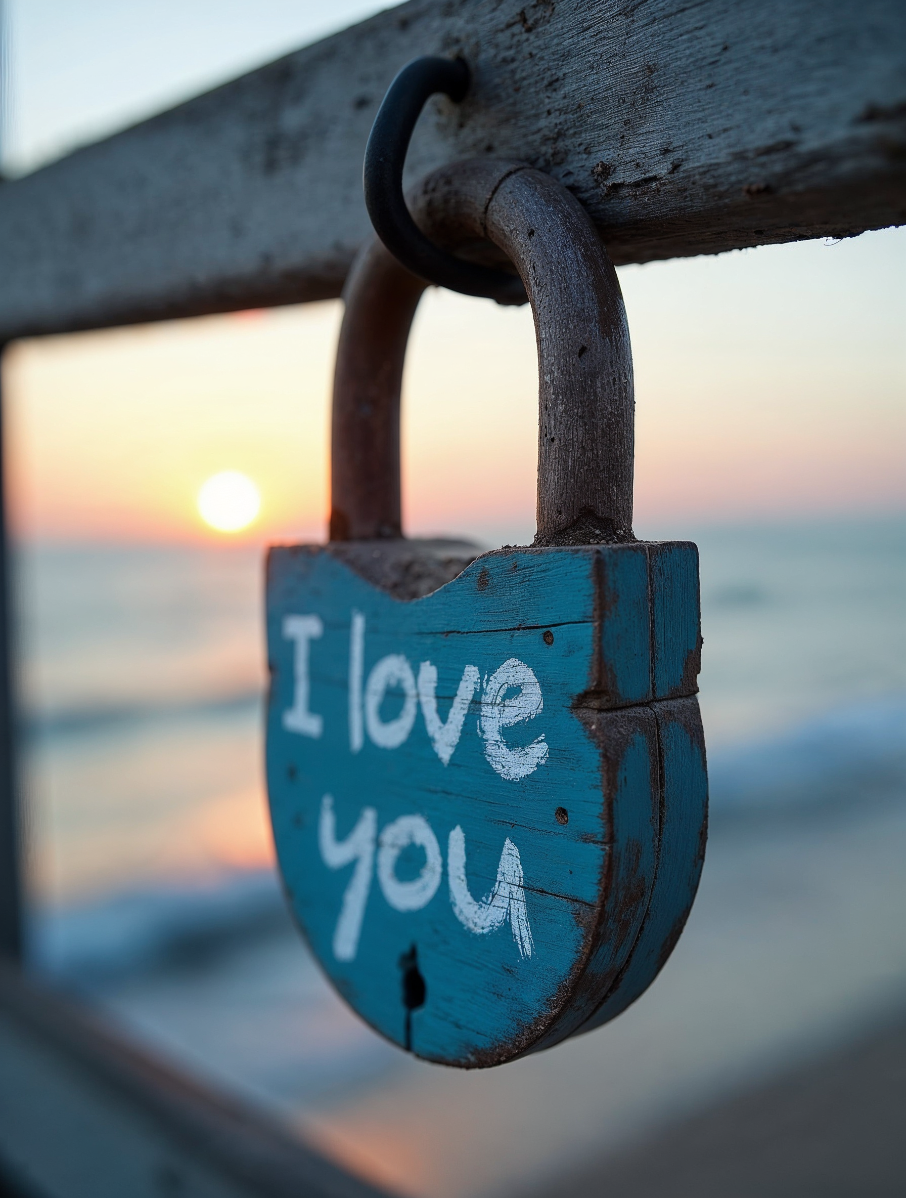 A weathered blue padlock with 'I Love You' written in white letters hangs from a wooden railing at sunset. The lock is secured with a rusty chain, overlooking a sandy beach and calm ocean waves. The warm sunset sky casts an orange glow on the scene.
