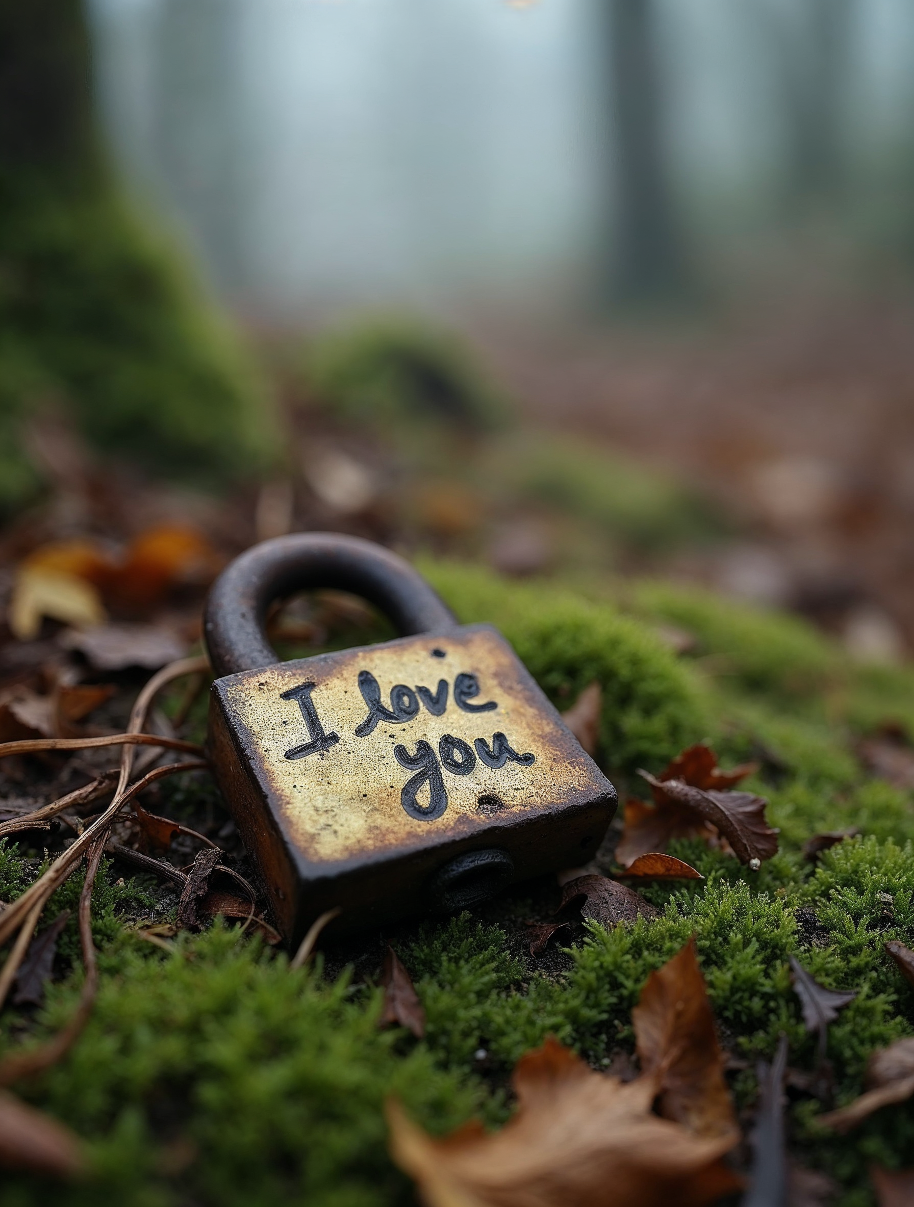 I love you, autumn leaves, blurred background, bokeh effect, engraved text, fall foliage, foggy woods, forest, green moss, heart symbol, moss, nature, outdoor, padlock, romantic symbol, rusty lock, shackle, vintage lock, woodland, love lock