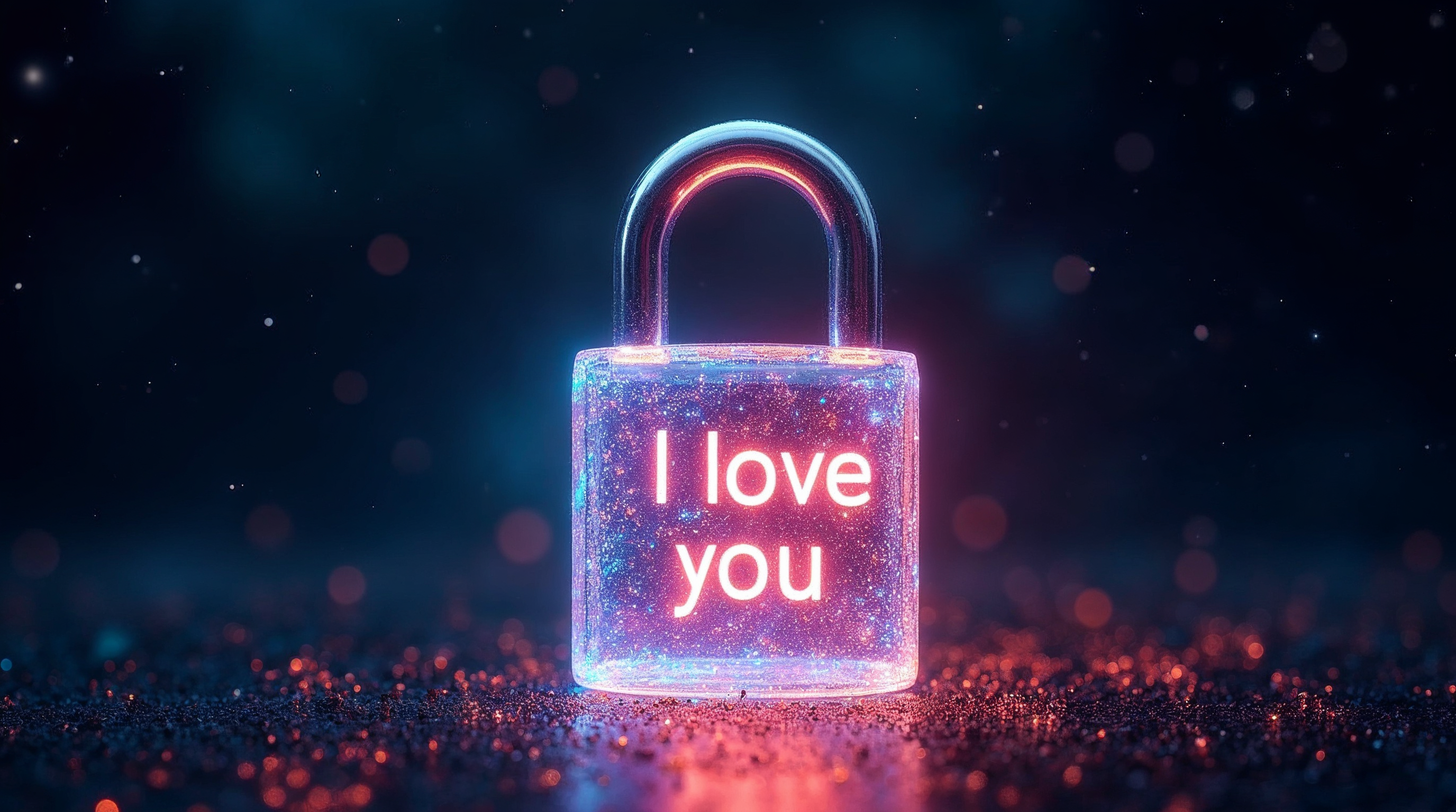 3D render, I love you, affection, blue glow, bokeh background, crystal, cyberpunk, dark background, digital art, futuristic, glowing, heart symbol, holographic, illuminated, love, love message, neon, padlock, pink, red glow, romantic, shiny, sparkles, symbolic, transparent, valentine, lock