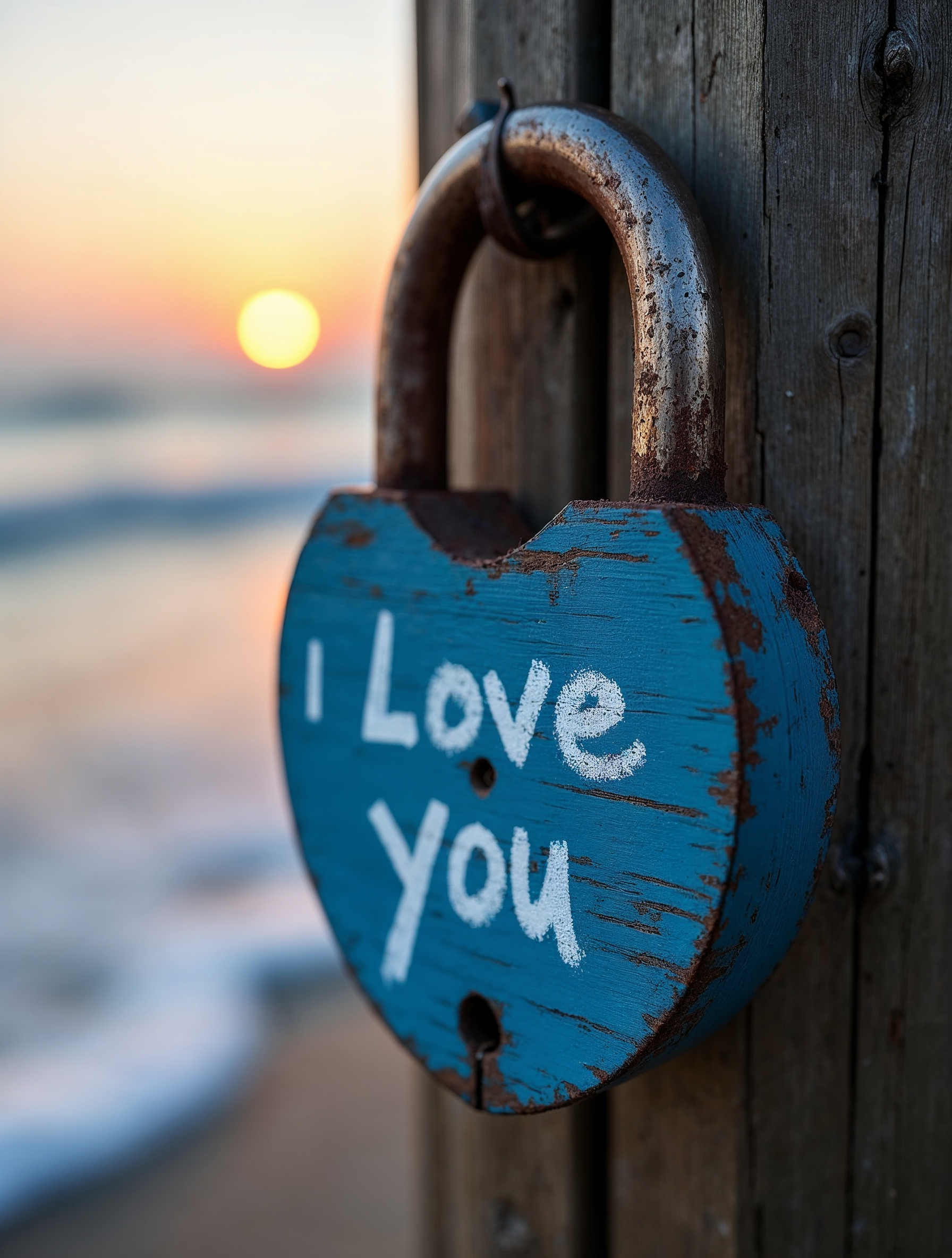 A weathered blue heart-shaped lock with 'I Love You' painted in white hangs on a wooden pier post. A sunset glows behind it with ocean waves visible in the blurred background. The rusty padlock adds a vintage touch to the romantic scene.