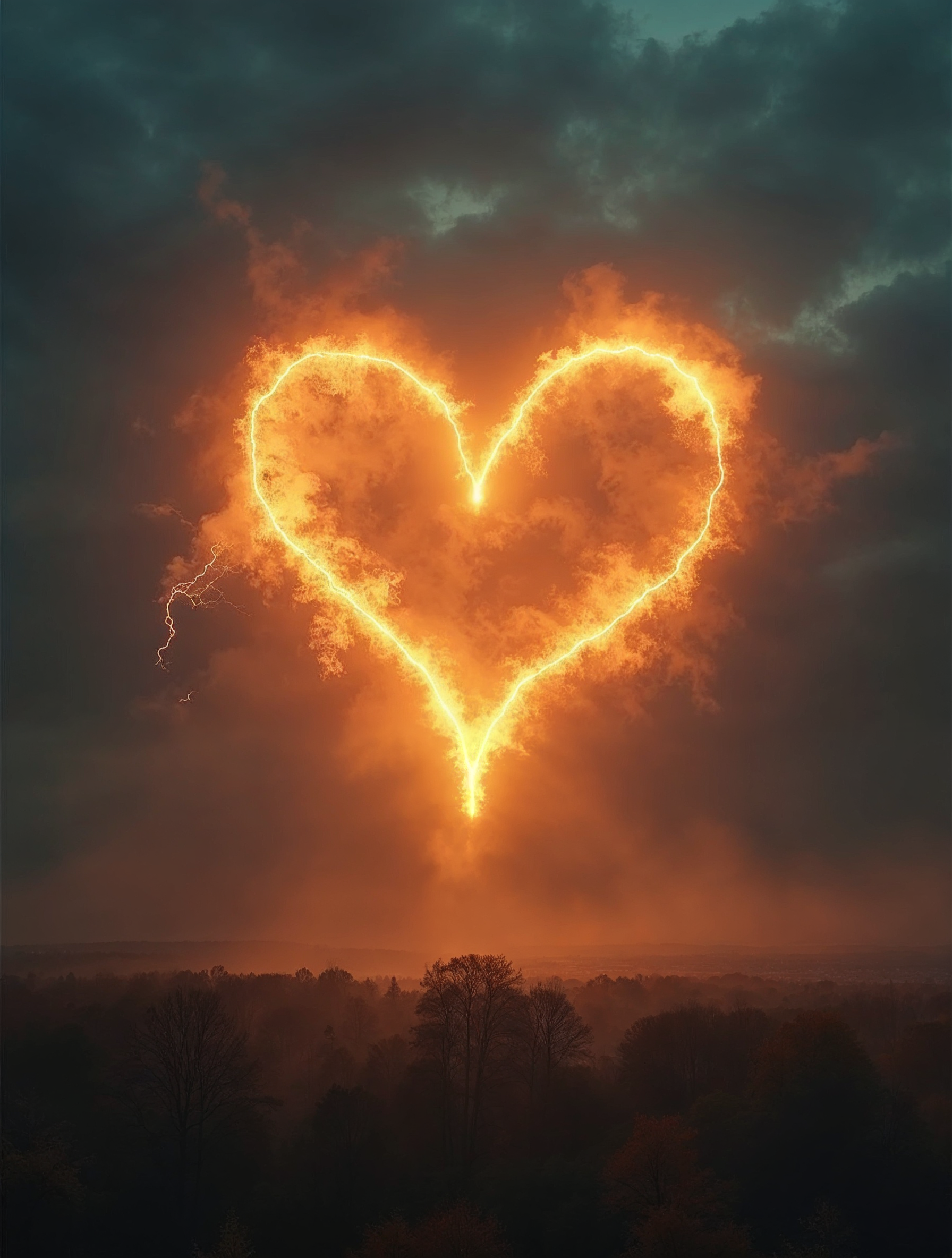 atmospheric scene, burning heart, cloudy sky, dark clouds, digital art, dramatic sky, fiery symbol, fire heart, fire symbol, flame heart, forest horizon, glowing heart, heart shape, illustration, intense flames, lightning bolt, love symbol, misty landscape, orange flames, storm background, stormy sky, thunder clouds, trees, fiery heart