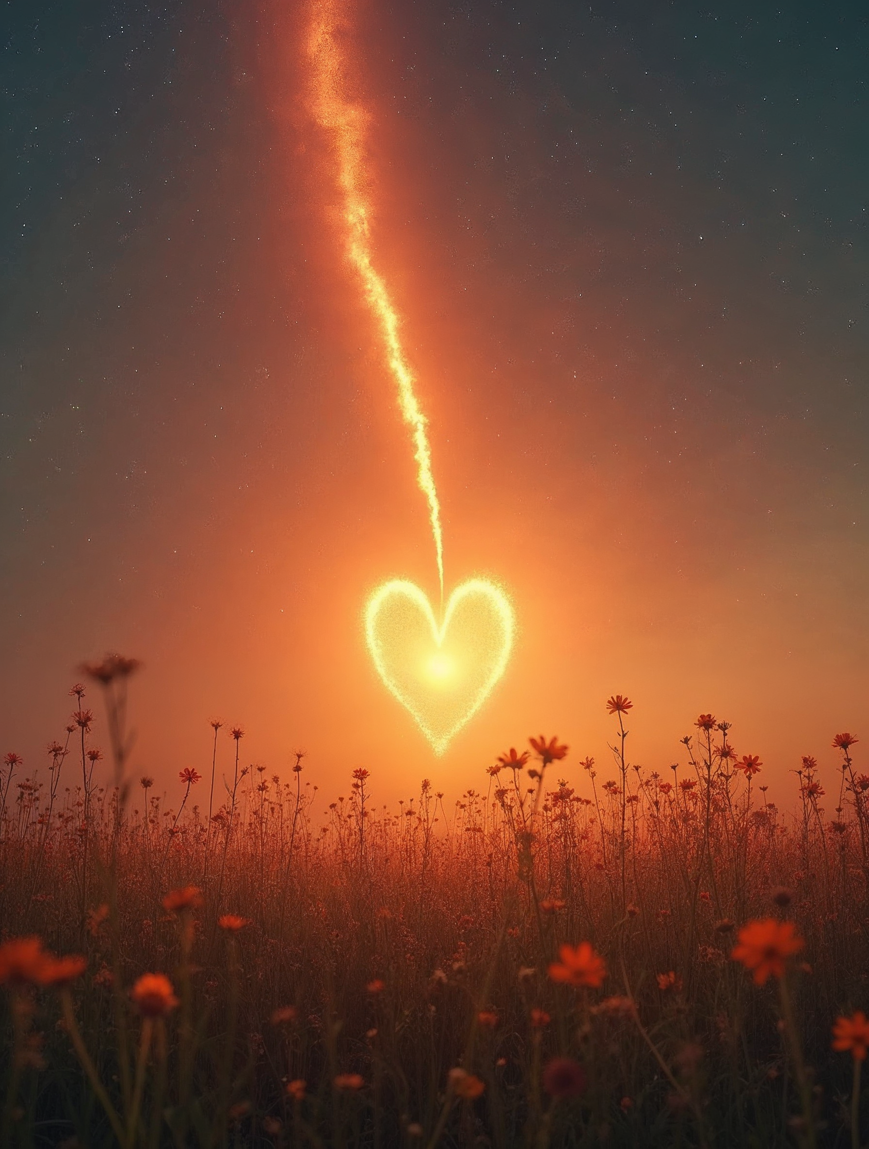 cosmos flowers, daisies, digital art, dramatic sky, field landscape, flower field, glowing heart, heart shape, illustration, lightning bolt, lightning strike, nature scene, night sky, orange glow, red flowers, sky phenomenon, starry sky, sunset sky, vibrant colors, yellow lightning, heart lightning