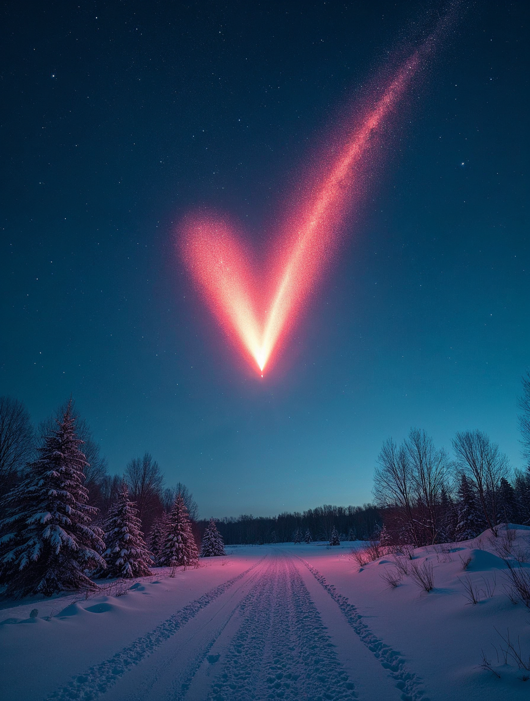 aerial heart, astronomy, blue sky, celestial event, comet trail, dark sky, forest path, frozen trees, glowing heart, heart shape, meteor trail, night sky, pine trees, red meteor, romantic sky, sky phenomenon, snow covered, snow ground, snowy forest, snowy path, starry sky, stars, trail, winter landscape, winter night, heart meteor